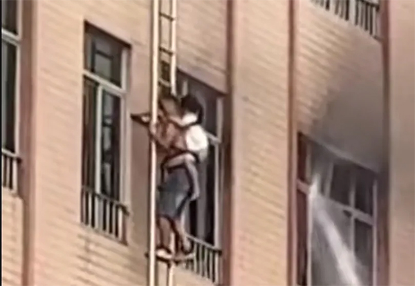有人懷抱幼童或?qū)⒑⒆咏壴谏砩?,從外墻消防梯爬下逃?/p>