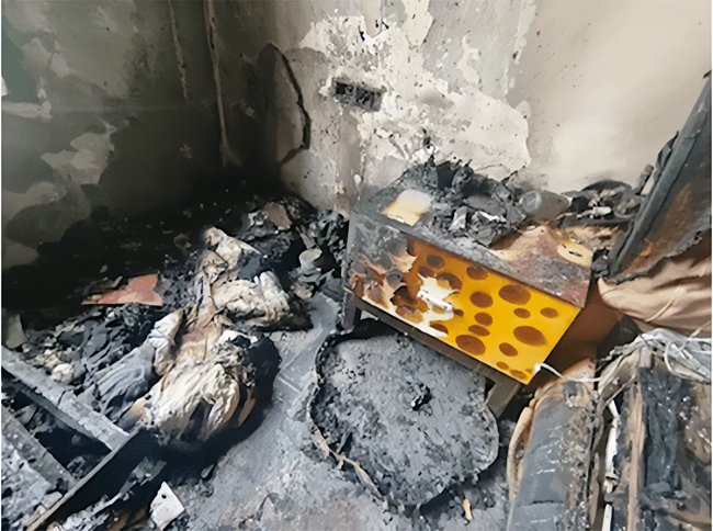 電蚊香的正下方,放置有一個(gè)收納盒及一床棉被、衣物,發(fā)生火災(zāi)的當(dāng)晚家中無人,火災(zāi)共造成臥室沙發(fā)、床及空調(diào)等被燒毀,客廳及餐廳墻面均被濃煙熏黑。