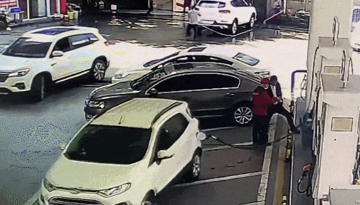 司機(jī)低頭玩手機(jī),油槍未取出就開車駛離,結(jié)果拽倒加油機(jī)。