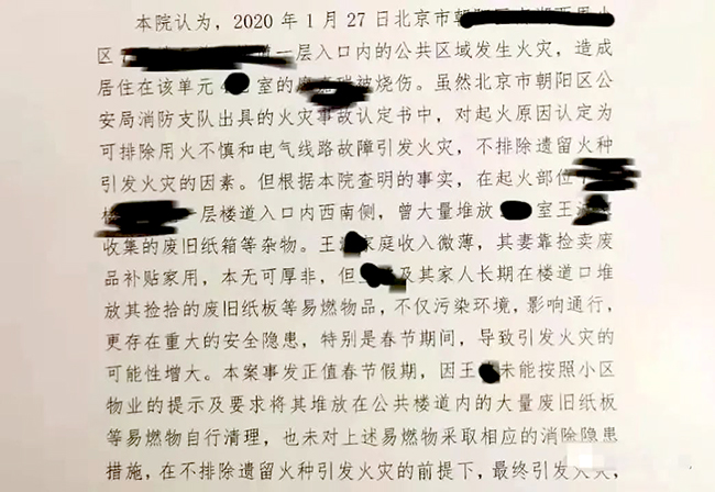 2020年1月27日,北京市朝陽區(qū)一居民王某某因在樓道堆放雜物引發(fā)火災(zāi),致鄰居被嚴(yán)重?zé)齻?/strong>最終判決王某某賠償受害人全部費(fèi)用633萬余元的70%,即443萬余元,物業(yè)公司對633萬余元全額承擔(dān)補(bǔ)充賠償責(zé)任。