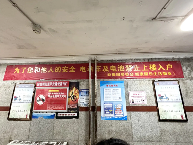 該小區(qū)也在樓道里、電梯外張貼了不少有關(guān)電動自行車的消防知識,并提示居民不要將電動車推入樓以及飛線充電。