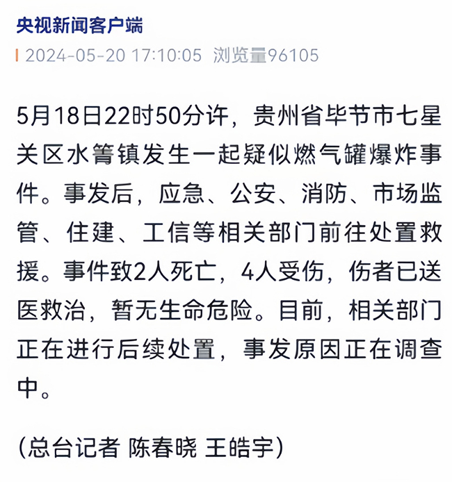 貴州省畢節(jié)市七星關(guān)區(qū)水箐鎮(zhèn)發(fā)生一起疑似燃氣罐爆炸事件