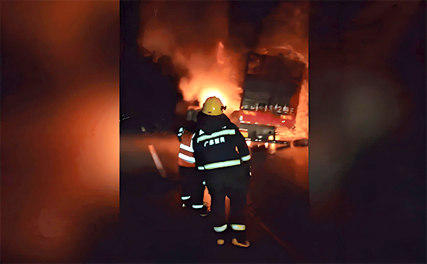 起火貨車正??吭趹?yīng)急車道上