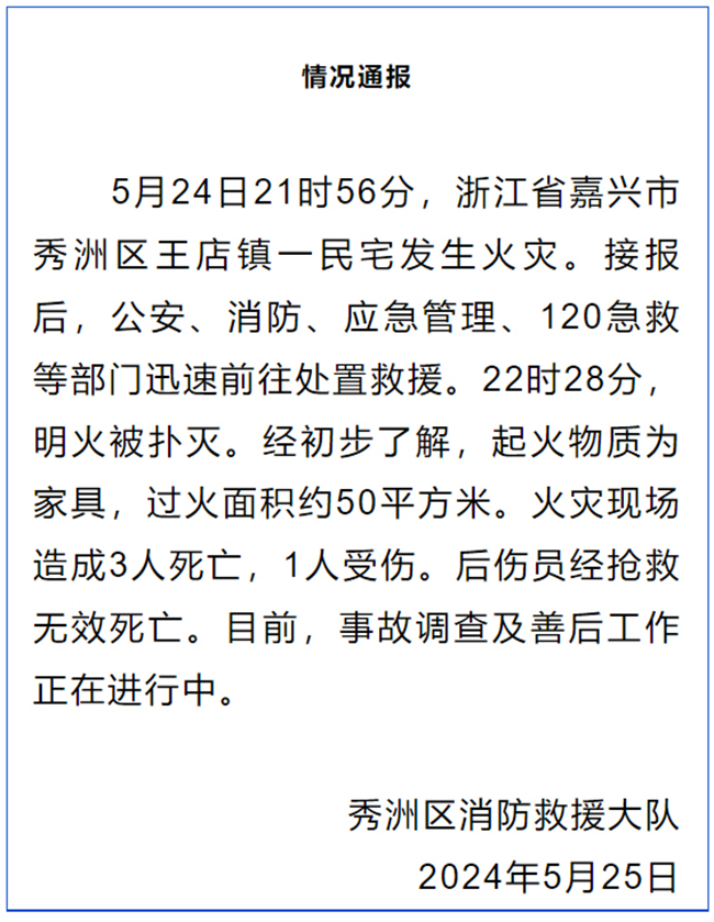 據(jù)浙江省嘉興市秀洲區(qū)消防救援大隊通報